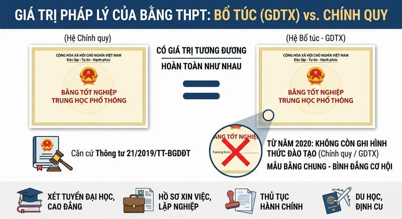 Điều này có nghĩa là, về mặt pháp lý, hai tấm bằng này là hoàn toàn tương đương. Bạn có thể sử dụng bằng GDTX để thực hiện các thủ tục hành chính, xét tuyển học lên cao, hoặc nộp hồ sơ xin việc mà không có bất kỳ rào cản pháp lý nào.